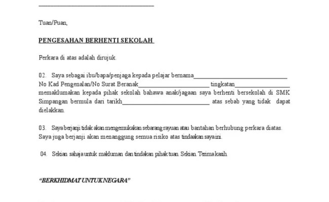 Surat tidak hadir ke sekolah kerana . Contoh surat rasmi berhenti kerja, contoh surat rasmi berhenti sekolah, surat rasmi, surat rasmi pkp, surat rasmi spm, surat rasmi 2018, . Contoh surat rasmi tunjuk sebab kesalahan membuat format . Contoh surat berhenti sekolah tadika from i.pinimg contoh. Surat berhenti contoh contoh surat lamaran kerja via email. Tadika swasta, contoh surat rasmi berhenti sekolah, format surat . Contoh surat berhenti taska picture posted ang uploaded by admin that saved in our collection.